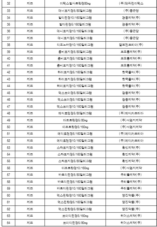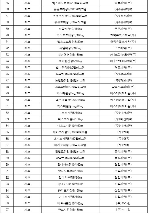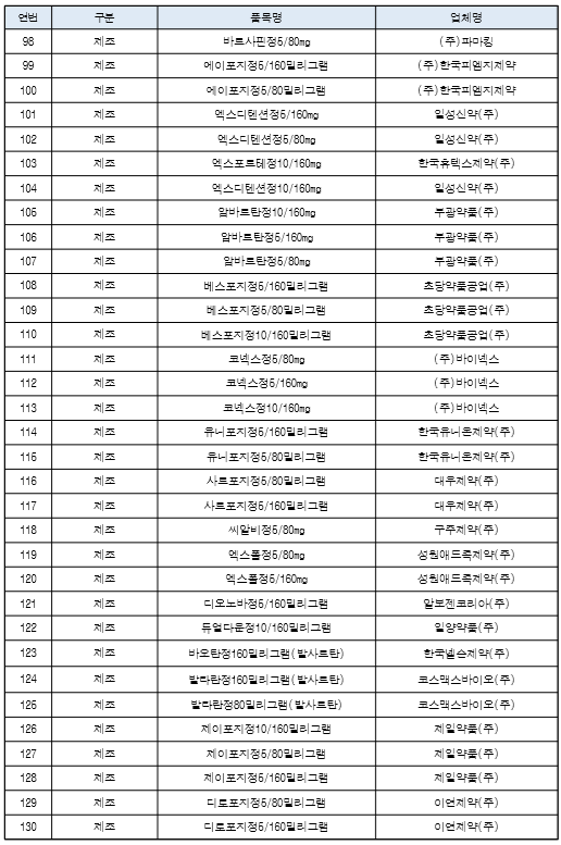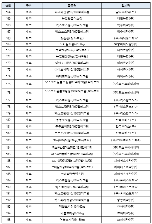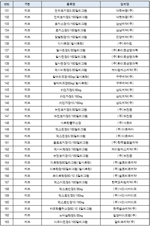 트윈스타정, 아모잘탄정, 엑스포지정, 노바스크정, 세비카정, 카나브정, 테르민우보정, 델라트렌정, 지오반필름코팅정, 세비카에이치시티정입니다.