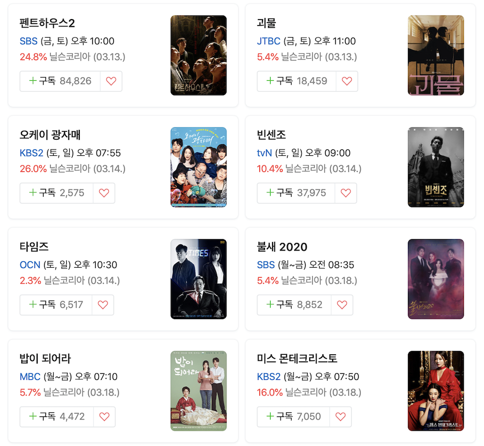 위의 표를 보자. 총 9개의 드라마가 전시되어 있다. 이 중 1위는 바로 KBS 2TV의 신작 OK 광자매. 2위는 SBS 펜트하우스2 시청률 나쁘지 않다고 생각해? 3위는 KBS1 누가 뭐래도 4위는 미스 몬테크리스트, 5위는 tvN 빈센조, 6위는 MBC 밥이 되어라 공동 7위는 불새 2020과 괴물. 마지막으로 꼴찌는 OCN 타임스가 기록하고 있다. OCN 드라마라… 되게 오랜만인 것 같은데 차근차근 살펴보자.