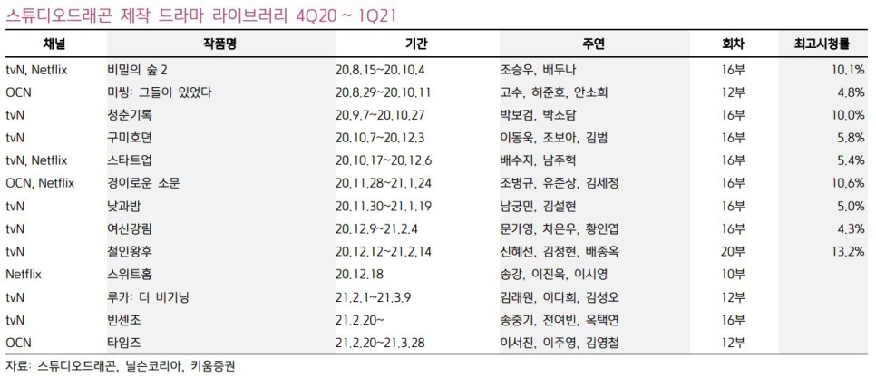 스튜디오 드래곤 콘텐츠 출처 : 키움증권 스튜디오 드래곤에서 방영하는 대부분의 내용이 케이블과 OTT에 관련된 신작들이 많아요~