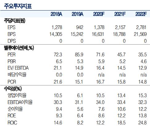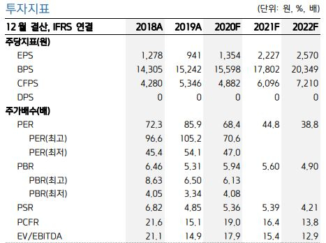 출처 : 유진투자증권 이현지 자군을 리스트 20년도 지표 EPS(TTM)=(1,354+1,378)/ 2=1,366원 PER(TTM) = 106,800/1,366= 78.18