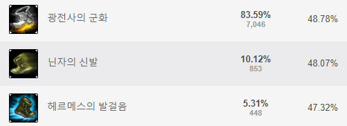 원딜러이기 때문에 광전사의 군화를 선택하는 비율이 매우 높습니다.미들시언 미들시언의 경우 강력한 라인전에서 초반 근거리 챔피언을 상대로 주도권을 잡을 수 있습니다.