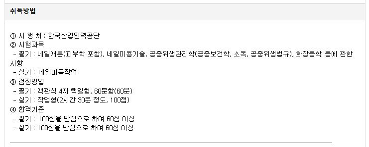 먼저 네일아트 국가자격증 필기시험은 객관식 4가지 보기에서 60문제 출제! 그리고 100점 만점에 60점 이상만 맞으면 되기 때문에 큰 부담은 없다.
