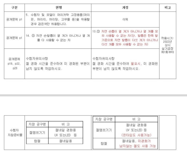 실기는 2022년도 들어 바뀐 부분이 조금 있는데 (1) 머리카락 고정용품 관련내용 삭제 -> 검정이 아니더라도 좋음 (2) 손톱이 10개가 아니거나, 10개 모두 사용할 수 없는 자/손톱은 한쪽 발톱이 5개가 아니거나, 5개 모두 사용할 수 없는 자이어야만 모델기준에 부합한다.(3)젤 경화 시간을 준수하고 필요에 따라 미경화 부분이 남지 않도록 작업해야 한다(4) 젤 램프 기기는 핀 타입 사용 가능(5) 젤 네일용, 미경화가 남지 않는 젤도 사용 가능한 5가지로 나뉜다!