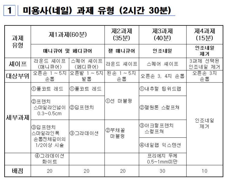 덧붙여 네일 아트 국가 자격의 실기 과제는 모두 4개라고 생각할 수 있지만, (1) 매니큐어, 페디큐어(2) 젤 매니큐어(3) 인공 네일 (4) 인공 네일 제거로 되어 있다.