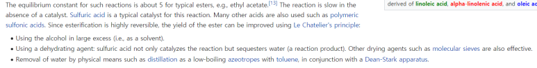 • – 에스터화는 가역성이 높기 때문에 LeChatelier 원리를 이용하여 에스테르 수율을 개선할 수 있다.1. 알코올을 과도하게 사용(용매) 2. 탈수제를 이용: 술폰산은 반응을 촉진할 뿐만 아니라 물(반응생산물)을 흡수한다. 또한 분자체와 같은 다른 건조제도 효과적이다. 3Dean-Stark 기구를 이용하여 톨루엔이 함유된 공비 혼합물을 약하게 끓여서 증류하는 것과 같은 물리적 방식으로 물을 제거.