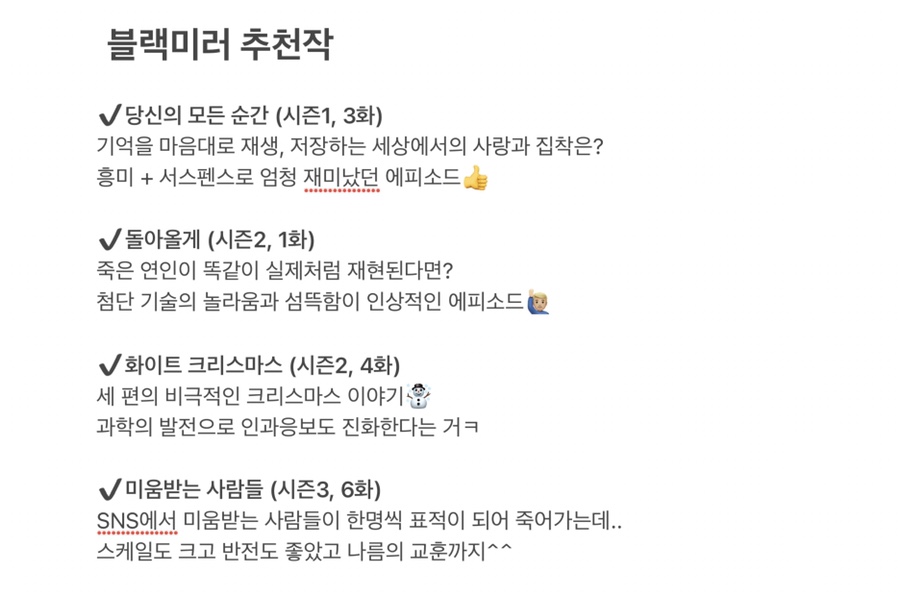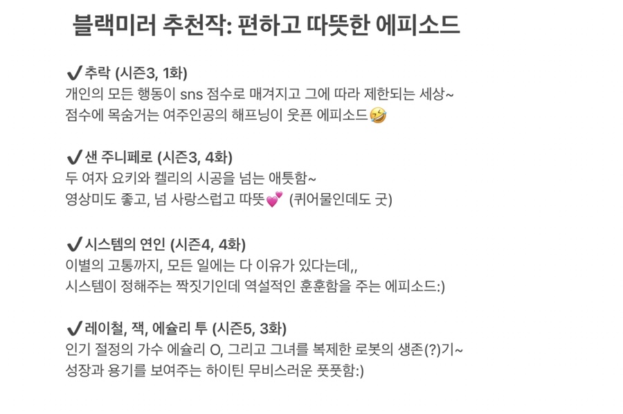 한편 한편의 영화같고 몰입감 최고의 블랙미러… 무엇을 볼까 고민하시는 분들을 위해 다크하고 강한 것 / 따뜻하고 편안한 것으로 나누어 소개해 보겠습니다:)