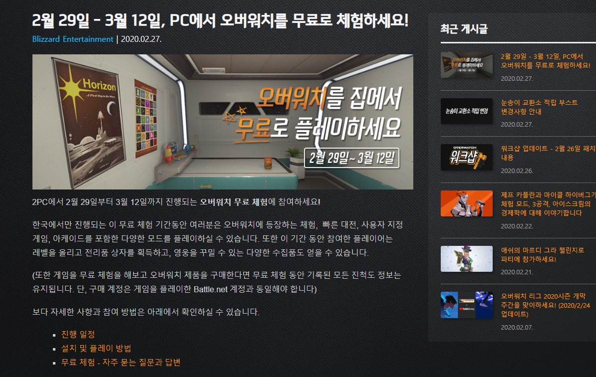 오버워치를 플레이하는 트위치 스트리머의 방송을 보면 총 6개의 스프레이도 받을 수 있다. 이외에도 체험 모드를 플레이 메뉴에서 새로운 밸런스 업데이트, 규칙, 게임 모드 등을 체험할 수 있게 됐다. 공개 테스트 서버처럼 버그를 수정하거나 안정성을 테스트하는 것이 아니라 개발자가 테스트하는 것을 미리 볼 수 있는 정도로 보면 될 것 같다. 다양한 시도를 하는 것 같아 오래된 사용자로서 반가운 소식이 아닐 수 없다. 적극적으로 활용해보고 피드백을 줄 수 있도록 지원하면 더 좋지 않을까 하는 생각도 든다.체험모드의 공식적용 매칭이 상당히 빠르다!! 즐겨보자