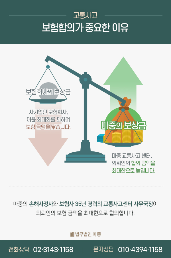 교통사고보험 합의금에 의한 소송을 할 경우에는 가해자의 보험회사와의 의견 조율도 거치게 됩니다. 또 피해자의 피해 정도가 어떤지를 입증할 수 있는 객관적인 자료도 필요합니다. 이러한 과정을 거쳐 법원을 통해 적정한 교통사고 보험 합의금이 나오게 됩니다. 하지만 이런 과정이 혼자서 부담하기에는 너무 복잡하고 까다로운 과정입니다.
