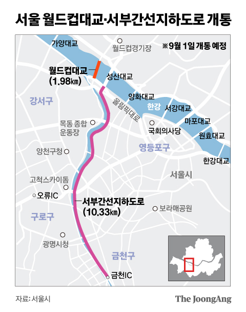 서부간선도로와 내부순환로로 항상 직접 연결하는 월드컵대교는 연장 1980m, 폭 31.4m의 왕복 6차선 교량이다. 2002 한일 월드컵을 기념해 명명됐으며 2010년 착공해 약 11년 만에 완공됐다.