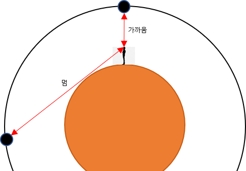 관측자의 입장에서 본 천장과 지평선에서의 거리 포보스는 지구의 달처럼 모행성에 아침저녁으로 고정되어 공전 주기와 자전 주기가 같아 항상 같은 면만 화성을 향하고 있습니다따라서 포보스의 한 면에는 항상 화성이 하늘에 위치해 있는데 천구의 1/4을 차지할 정도로 거대해 보입니다.