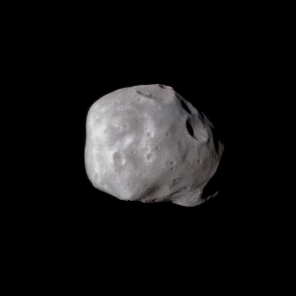 2005년 9월 17일에 마스 그 글로벌 서베이어가 촬영한 화성 표면의 포보스의 그림자(출처:NASA) 포보스와 데이모스의 기원에 대해서는 몇 가지 가설이 존재합니다.우선 두 위성 모두 분광형, 반사율, 밀도 등이 C형 또는 D형 소행성과 비슷해 소행성대에서 화성 중력에 이끌려 포획됐다는 것이 지금까지 가장 가능성이 높은 가설이었습니다.그러나 두 위성이 화성 적도 평면에서 거의 원형에 가까운 궤도를 공전하고 있음을 설명하기에는 화성의 중력이나 대기의 밀도가 너무 낮습니다.또한 포보스의 밀도가 1.887g/cm3으로 단단한 암석이 아니며 30% 정도 빈 다공성도 소행성 포획설과 일치하지 않습니다.지구의 달과 마찬가지로 형성 초기의 큰 천체와 충돌하여 분리된 파편이라는 설이 유력합니다.