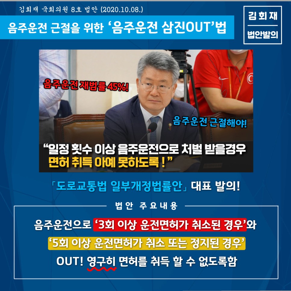 제8호 법안으로 도로교통법 개정안을 발의했습니다.’음주운전 삼진 OUT법’입니다.