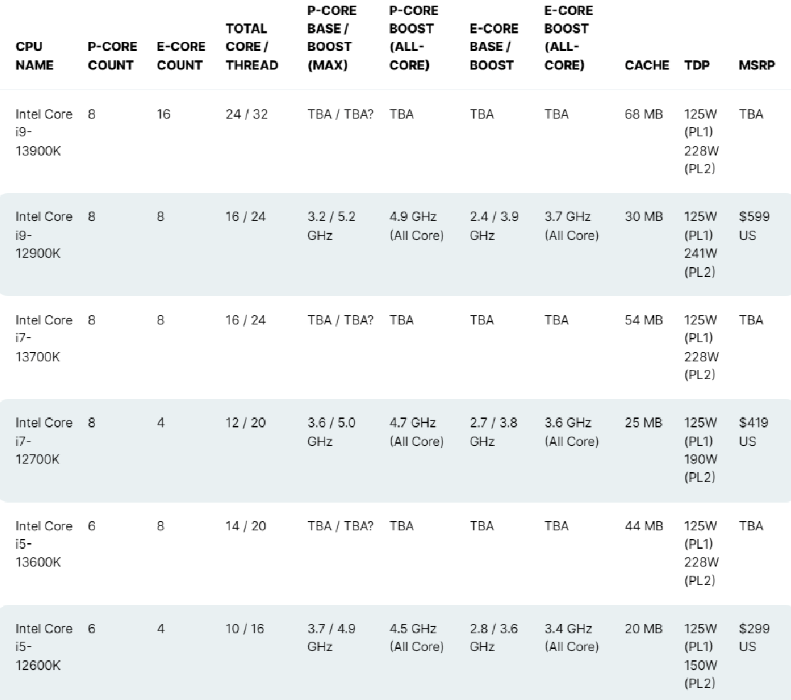 모델명 i9-13900Ki9-13900KFi7-13700Ki7-13700KF5-13600KF 클럭(기본~최대) 3.0~5.8GHz 3.4~5.4GHz 3.5~5.1GHz 가격(달러) $589$409$312$294 가격(원) 1,063,300원1,004,190원785,060원654,380원 526,940P 코어 + 7248