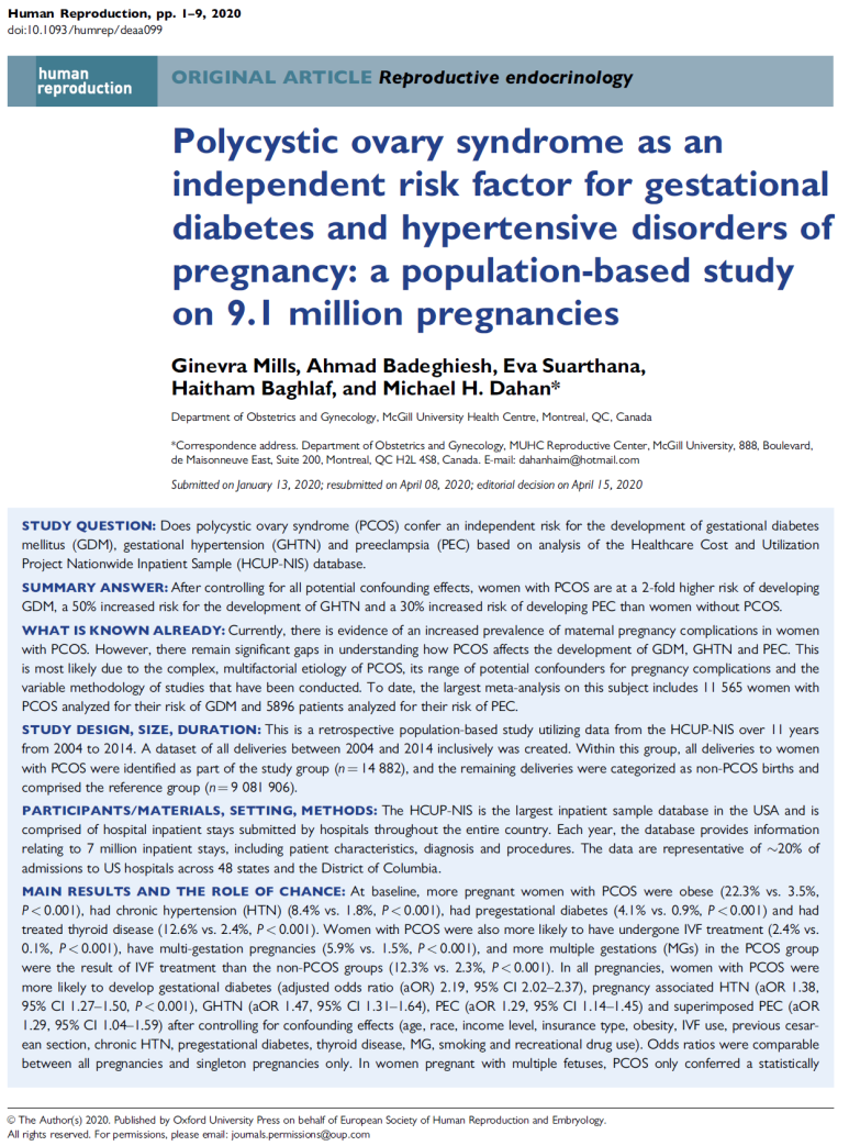 [다낭성 난소증후군]임신성 당뇨와 임신성 고혈압의 독립적 위험인자_유럽생식의학회지