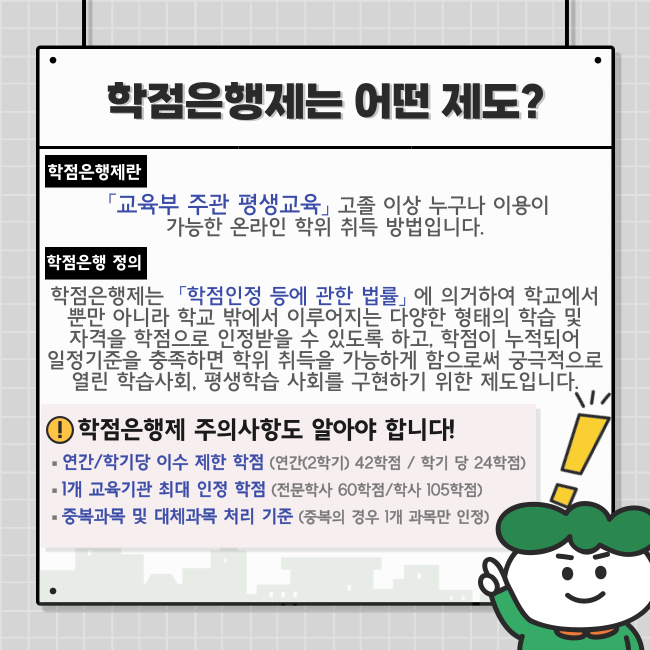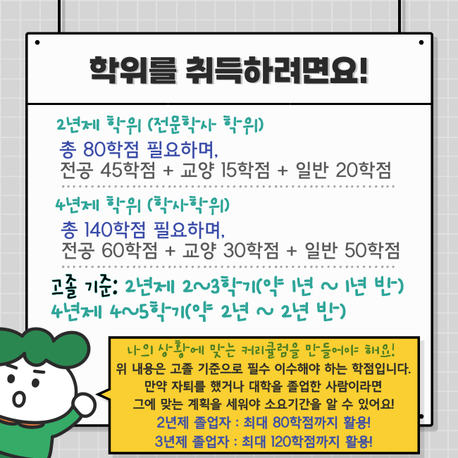 다양한 학점 이수 방법을 설명하면서 학위 취득 기간에 대한 부분을 정했는데 저는 3년을 땄어요.