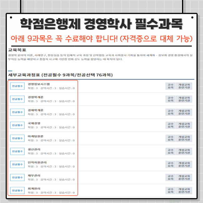 경영정보시스템, 경영학개론, 경제학개론, 국제경영, 마케팅원론, 생산관리, 인적자원관리, 재무관리, 회계원리까지요.학위를 취득하기 위해서는 반드시 수료해야 하는 과목이라고 생각하면 되는데 예외적인 경우에는 전공 자격을 취득하는 것으로 대체할 수 있다는 겁니다.