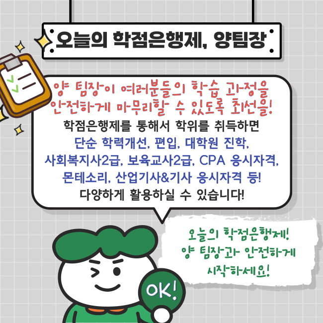 학점은행제라는교육방식은원하는목표를정해서자율적으로학업을하는방식이기때문에학위취득을천천히하셔도되고타이트하게해서단기간에취득하셔도됩니다.