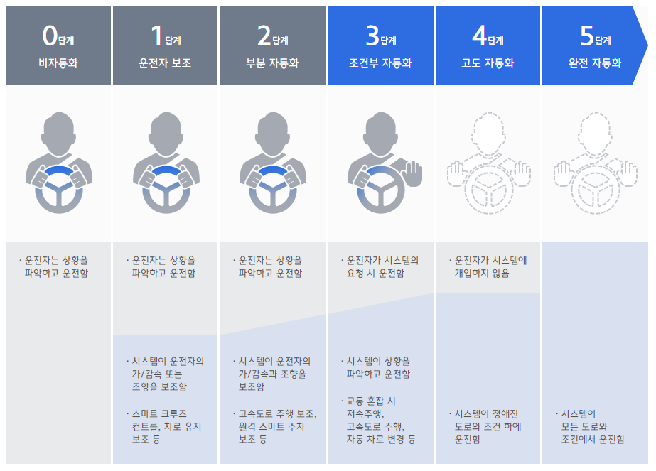 출처- https://www.hyundai.co.kr/TechInnovation/Autonomous/Roadmap.hub 자율주행 시스템은 총 6단계로 나누어져 있는데, 먼저 단순 주행 중에 시스템이 경고를 해주는 전방충돌방지 보조, 후방충돌경고가 0단계에 해당합니다.