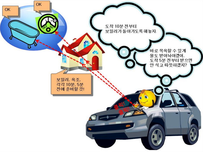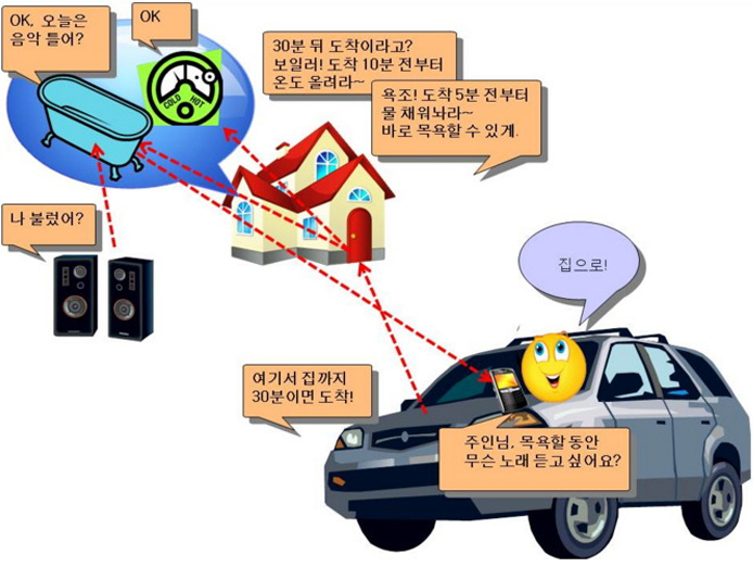 만물인터넷은 자동차가 목적지를 인식해 집으로 확인되면 집에 있는 네트워크에 연결해 도착시간을 알리고, 집에 있는 네트워크는 기존 사용자 패턴을 인식해 목욕물을 준비해 내가 즐겨 듣는 노래를 틀어주는 등 다양하게 활용됩니다.