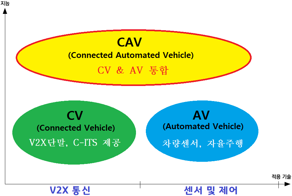 o 적용되는 V2X 기술, 센서 기술, 제어 기술을 통해 CV(Connected Vehicle), AV(Automated Vehicle), 그리고 이들이 통합된 CAV(CV+AV)로 분류