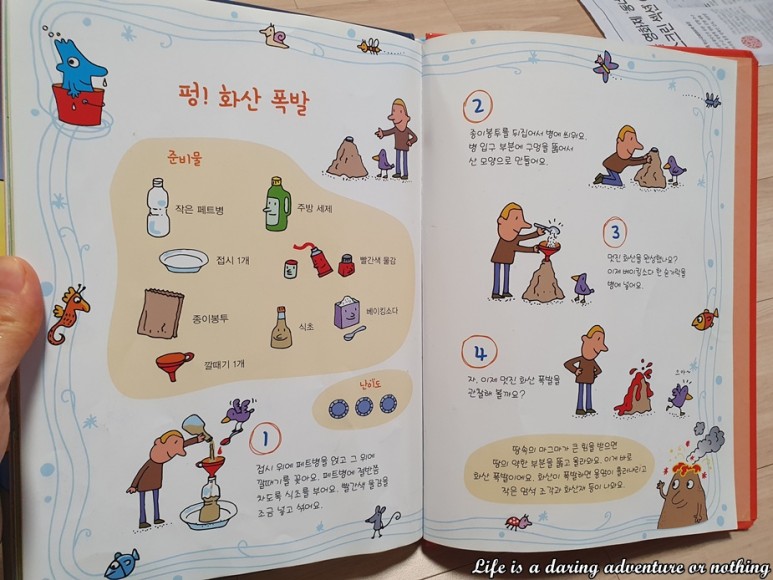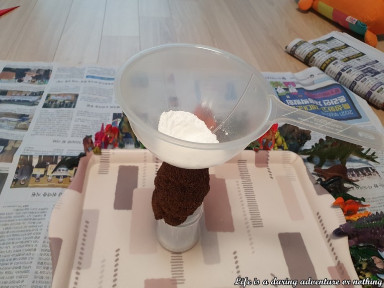 화산 관련 책을 스무 번 정도 읽어드렸는지(눈물 아저씨 시리즈에는 책 마지막에 집에서 엄마와 할 수 있는 실험놀이 소개가 나와 있다.아이가 이걸 보고 자꾸 화산폭발을 만들어 보고 싶다는 생각에 해보기로 했다.