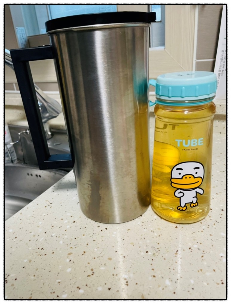 신랑이 1L 텀블러에 콩가루 2~3개 정도 넣고 하루 종일 3번 정도 끓여 먹기도 합니다.