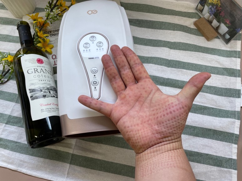 실제 내부에 튼튼하고 뾰족한 지압판이 꽉 채워져 있는 구조여서 손을 넣은 채 기다리면 손가락 곳곳을 누를 수 있었습니다.놓쳐버릴 구멍이 생기지 않도록 집중적으로 관리해주기 때문에 하루에 한두 번만 실행해도 다음날 움직임이 좋아질 거예요.