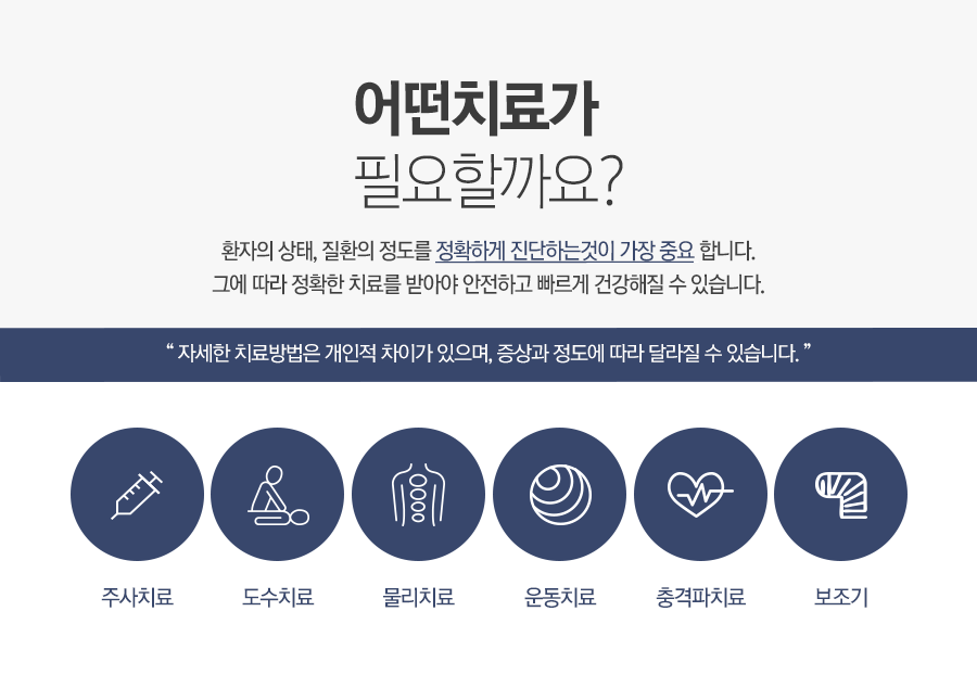 다양한 비수술 치료방법이 마련되어 있어 정밀한 검사 후 환자 개개인에 맞는 치료를 도와드리고 있습니다.