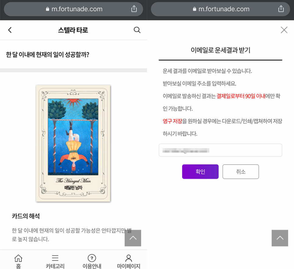 위에서 첨부한 영상을 보면 해당 타로점을 통해 운세를 확인할 때 과정이 어떻게 되는지 한눈에 이해할 수 있다. 유료 서비스의 경우 하나의 카드를 선택한 후 카드 확인 버튼을 누르면 결제창으로 이동하게 된다. 결제수단은 포천에이드 사이트에서 충전할 수 있는 포천머니에서 시작해 신용카드, 휴대폰 결제, 네이버페이 등 다양한 형태로 이용할 수 있어 편하게 결제할 수 있다.
