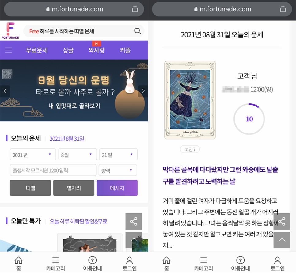지난 8월 31일 나는 포천에이드 모바일 홈페이지 메인 화면에서 오늘의 운세를 알아보기 위해 생년월일과 출생 시각을 입력했다. 해당 무료 운세확인 서비스는 오직 모바일 홈페이지 메인 화면에서 생년월일과 출생시각만 입력하면 확인이 가능해 매우 편리했다. 나는 띠별, 별자리, 메시지 3개 중 메시지를 클릭했는데 해당 메시지는 타로카드를 통해 오늘 내 운세를 점치는 타로점이었다.