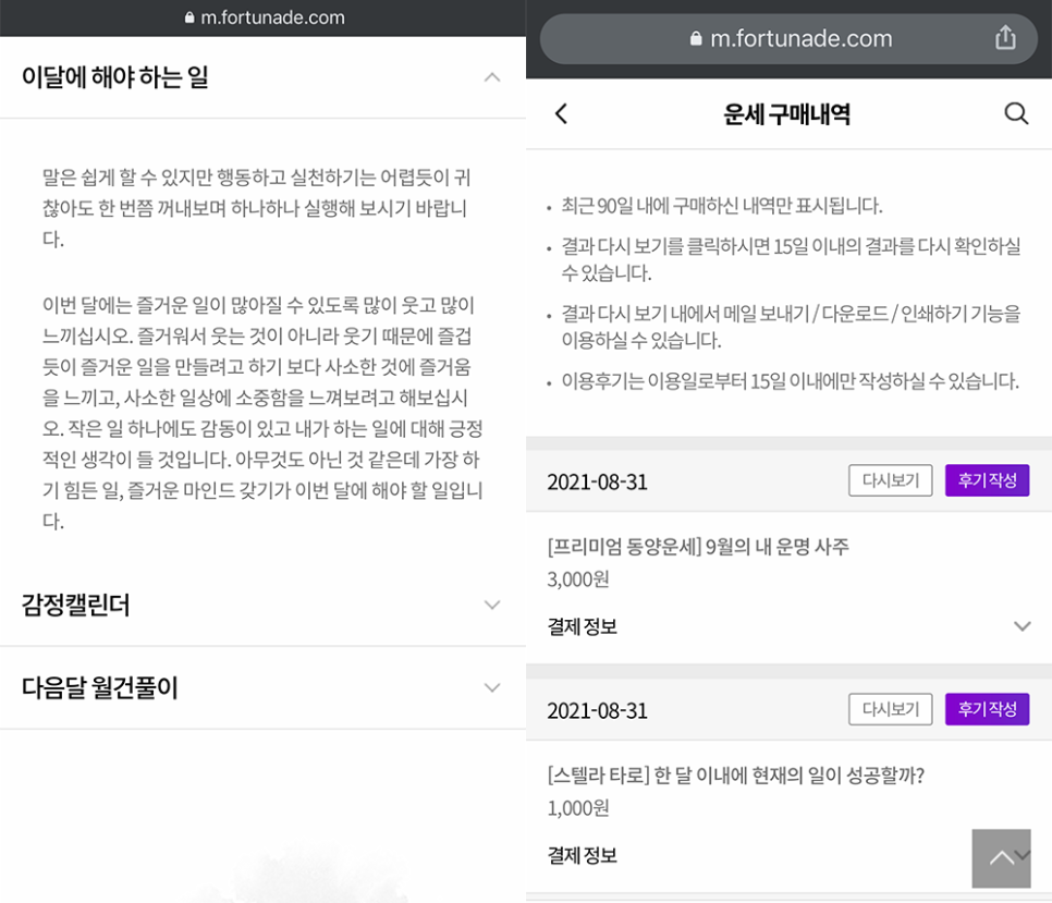 포천에이드 홈페이지를 통해 확인한 내 운세 내역은 운세 구매 내역을 통해 확인할 수 있다. 재확인 기능을 통해 15일 이내의 결과를 재확인할 수 있으니 참고하자. 크게 운세를 확인하는 것에 욕심을 내기보다 가끔 생각날 때 오늘의 운세를 점쳐보고 새로운 한 달을 시작하는 시기에 월간 운세를 점치면서 혹시 내가 주의해야 할 사항에 대해 숙지해보는 것도 나쁘지 않은 것 같다.