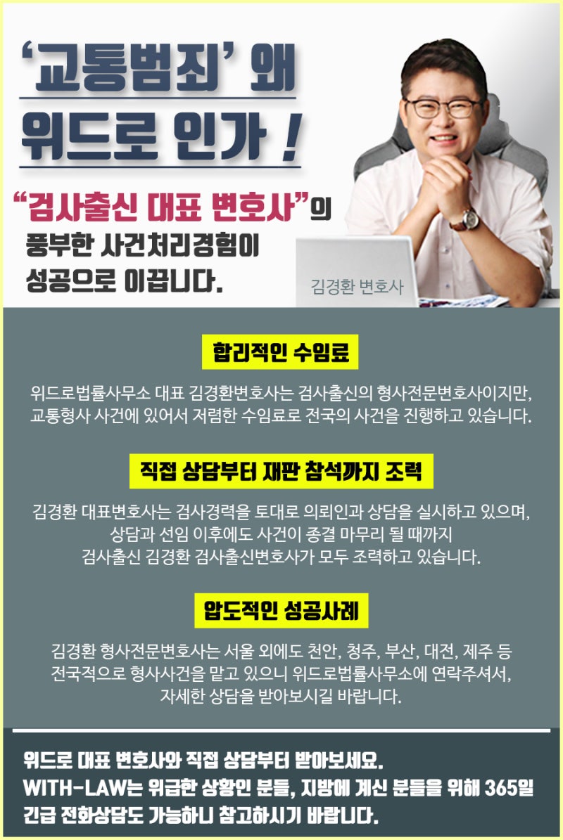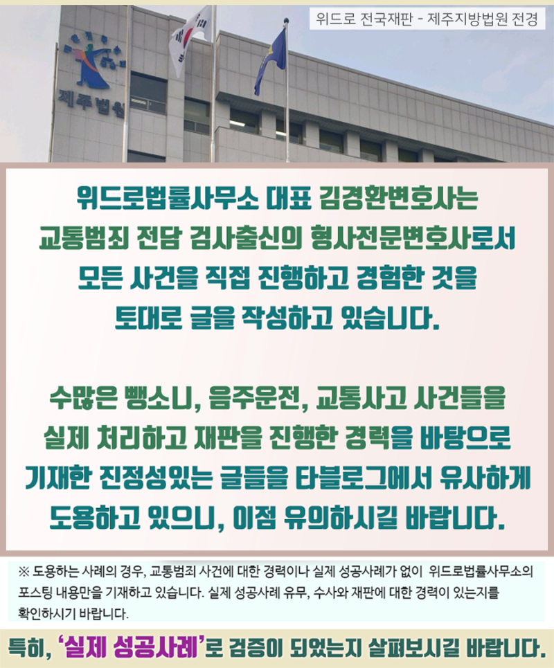 한 차례 동종범죄 전력이 있었지만 두 번째 재범과 만취 혈중알코올농도 수치로 수피사고까지 발생해 징역형이 선고될 가능성이 높은 불리한 상황에서 경찰 조사 전 벌금형 선처를 위해 청주음주운전 변호사를 찾게 돼 서울 서초동에 있지만 다양한 전문직, 대기업, 공무원 교통범죄 사건을 당연퇴직 중징계를 면할 수 있도록 해결한 경험이 많은 검사 출신 변호인과 1:1 상담 후 수사단계의 도움을 받기로 했습니다.