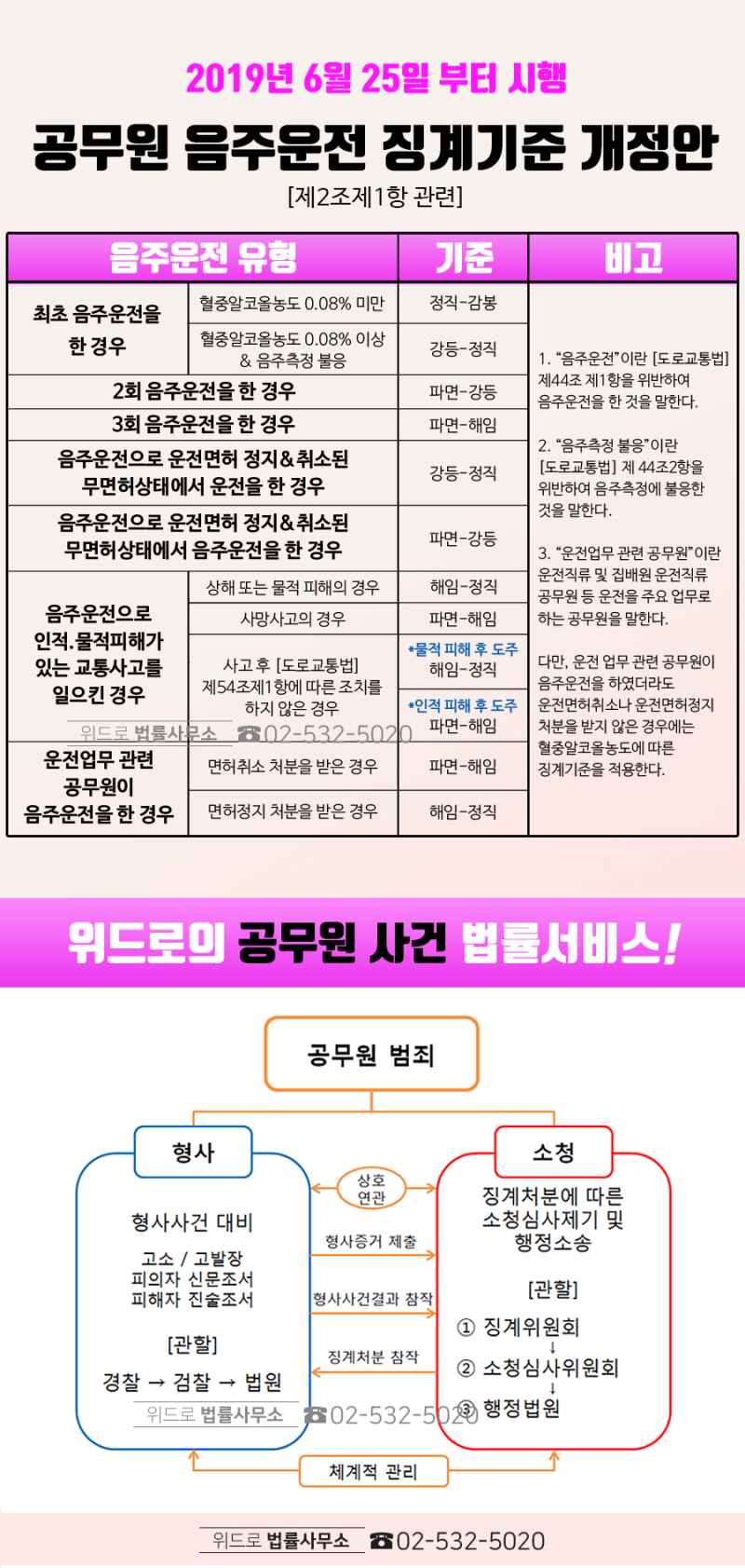 만취 혈중알코올농도 수치로 차를 몰다 적발되거나 교통사고를 발생시킨 경우 초범이라도 정식재판에서 집행유예 이상 선고되고 사안이 중할 경우 실형 선고까지 되어 있으며 직업이 공직자 신분이면 처분 결과에 따라 징계위원회에서 징계 수위가 바뀌게 되며 벌금형 이상의 형사처벌을 받게 되면 당연히 퇴직 결격사유에 해당해 일자리를 잃는 불이익이 발생하게 됩니다.한 잔이라도 술을 마신 경우 공무원 음주운전 사건의 경우 2021년 12월 30일부터 징계기준 개정안이 시행돼 동종 범죄 전력이 없는 초범이라도 0.2% 이상 만취주행을 하거나 측정 거부로 입건될 경우 해임~정직까지 중징계를 받을 수 있어 도로교통법 위반 혐의로 입건될 경우 벌금형 선처에서 불이익을 최소화해야 합니다.
