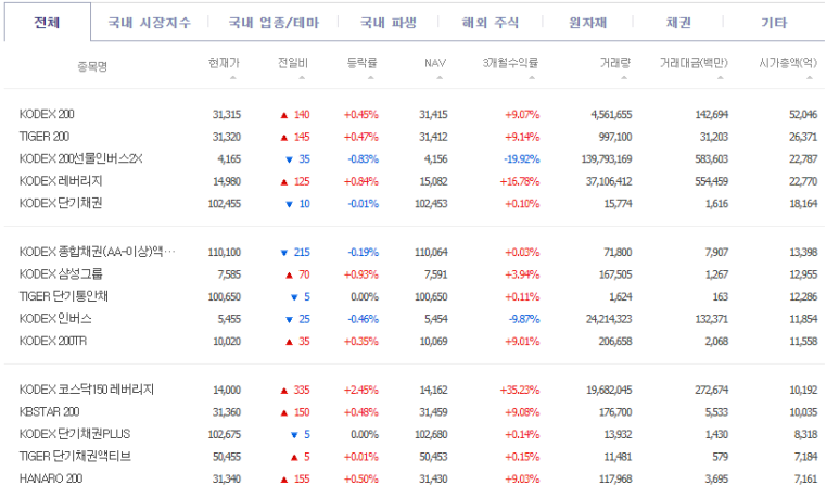 ㅇ상품 읽는법-KODEX 200 : 삼성자산운용에서 만든 상품-TIGER 200 : 미래에셋대우-KBSTAR 200 : KB증권-ARIRANG 200 : 한화투자증권-HANARO 200 : NH-문디자산운용-