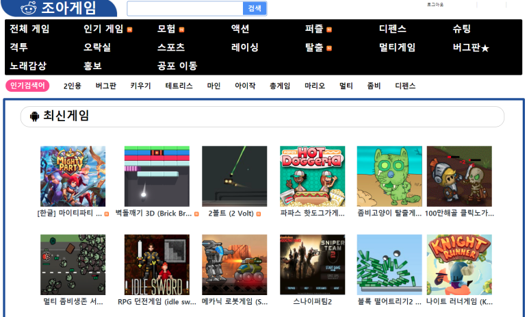 조아 게임 사이트의 메인 화면을 보면 위에는 장르에 따라 여러 가지 스타일로 분류되어 있고 아래에는 썸네일로 여러 가지 목록이 나열되어 있습니다. 최근 발매된 불과 물 게임 5탄과 슈퍼마리오 시리즈의 아이작 정식판 마인크래프트 그리고 온라인에서 즐기는 2D 배틀그라운드 지렁이 키우기까지 있습니다.