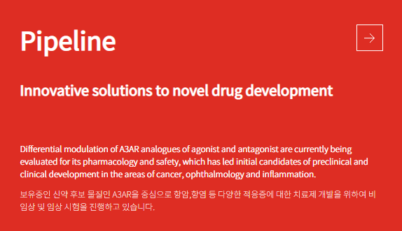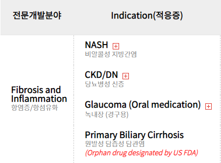 원발성 담즙성 담관염 치료 등 신약 후보물질에 대해 희귀 의약품 지정까지 담즙이 정체되어 발생하는 자가면역질환으로 조기발견을 놓치거나 간경화로 진행하는 등 염증완화와 담즙배설로 병의 진행을 늦추고 있는 곳으로 주목받고 있습니다!~글로벌 임상2상에 돌입한 무알코올성 지방간염, 그리고 녹내장 치료제에 관한 연구 등 향후 항암제 파이프라인에 대한 가치도 높이고 있습니다.뉴클레오시드 관련 연구를 축적하고 축적한 기술력을 바탕으로 신약 후보물질 도출 개발까지 진행하고 있습니다. NASH 치료제를 바탕으로 의약품 규제당국으로부터 안정성, 내동성, 그리고 약동학 등의 효능을 발견하였습니다.