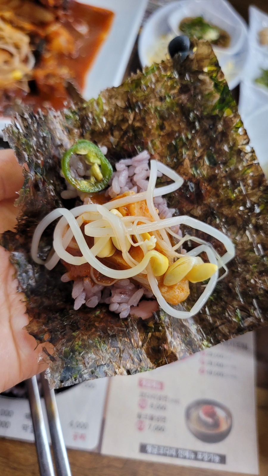 밥에 김을 올리고 코다리살과 양념을 얹고 콩나물과 간장 청양고추를 얹어 먹으면 된다.