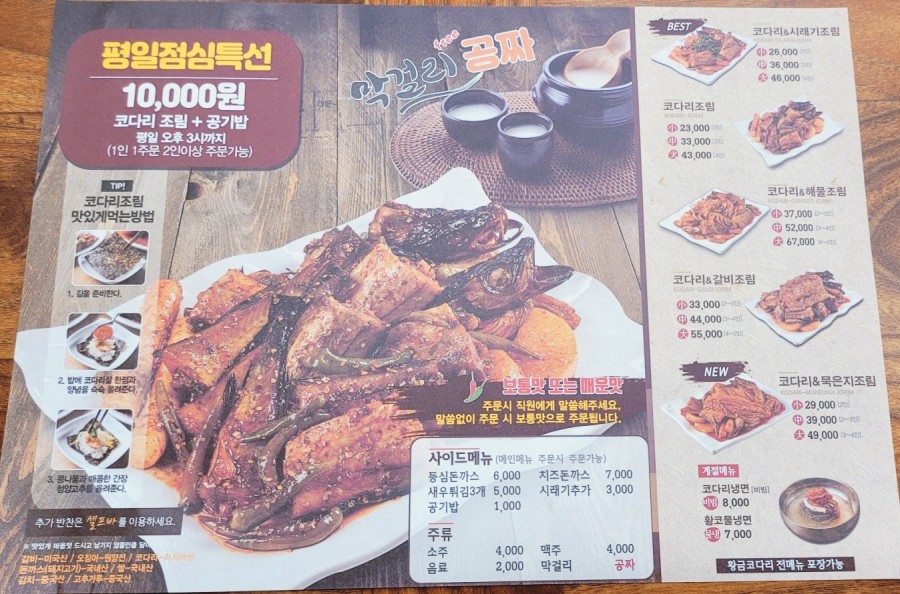 평일 점심특선(평일 오후 3시까지 2인분 주문 가능) 코다리조림+밥 1인당 10,000원 저렴한 가격에 푸짐한 식사를 할 수 있다.