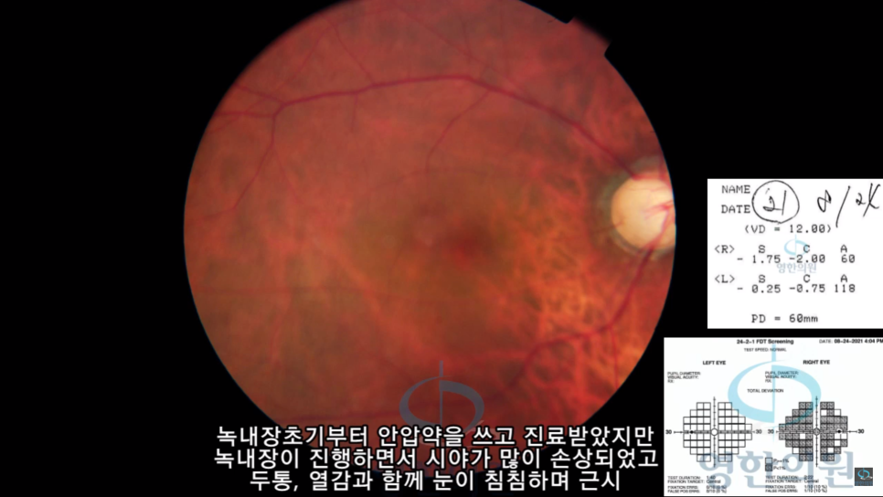 선명한 시야가 얼마 남지 않아 진행되어 버린 녹내장으로 두통, 열감, 시력 감퇴를 호소한다