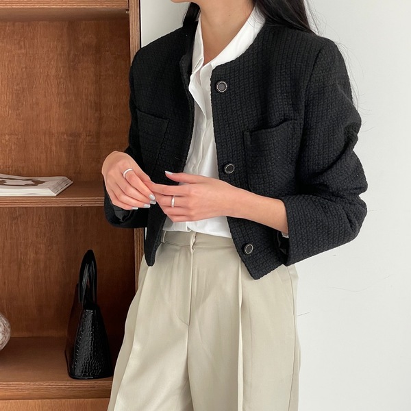 크롭 노카라 블랙 트위드자켓 예쁘고 힙한 코디