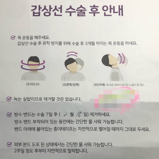 오전에 의사선생님이 회진을 오셔서 퇴원해도 된다고 집으로 가라고 하셨다. ? 아직 목마르는게 힘들고 좀 아프지만 그래도 집에 간다고 하니까 기분이 좋았다. 퇴원수속까지 한참 남았지만 일찍부터 짐을 풀고 옷도 갈아입고 기다렸다. ??그러자 다른 선생님이 와서 배관통을 빼서 목에 남은 죽은 피를 짜내 주신다. 고개를 뒤로 젖힌 채 앉아 있으면 목을 누른 채로 있게 되는데 기분이 별로 유쾌하지 않았어요.사람마다 뽑아내는 양과 걸리는 시간이 다른데 지금 생각해도 너무 과합니다.중간에 “좀 피곤하신 것 같은데 잠시 쉬었다 할까요?” 라고 물으셨는데, 아니요, 괜찮습니다. 빨리 해 주세요라고 말해주었다. 반창고와 거즈만 떼면 나머지는 저절로 떼인다는 것.무통기 연결한 손목에 바늘도 빼고 약도 처방받고 어쩌다 보니 퇴원수속 밟으면 마침내 웰컴백 홈???