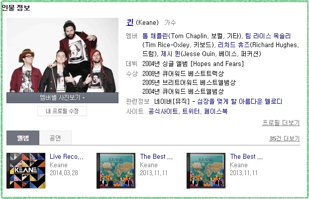 (source: 구글 images) Keane(킨)은 영국 출신의 피아노 록 밴드로 2002년 데뷔하여 큰 인기를 끌고 있는 가수입니다!! 2005년에는 브릿 어워드에서 ‘최우수 영국 밴드’, ‘최우수 영국 앨범’상을 수상할 정도였습니다!!흐흐흐도 록밴드지만 기타가 없는게 특징인 밴드에요!보컬 목소리도 좋고 음악 분위기도 좋아서 저도 정말 좋아하는 가수입니다.