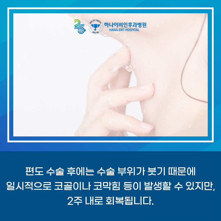 급성 편도염의 경우 1주일 이내에 치료됩니다. 편도와 아데노이드의 비대로 인한 편도염 증상이 나타날 경우 근본적인 치료를 위해 편도수술이 필요합니다. 1년에 3회 이상 편도염 증상으로 고통받고 있거나 1회 발생했을 때 고열을 동반한 편도염 증상이 심하게 나타나면 편도수술을 생각할 수 있습니다. 성인의 경우 편도피막을 포함한 전체 절제를 원칙으로 합니다. 편도 수술 후에는 수술 부위가 붓기 때문에 일시적으로 코골이나 코막힘 등이 생길 수 있지만 2주 이내에 회복됩니다.