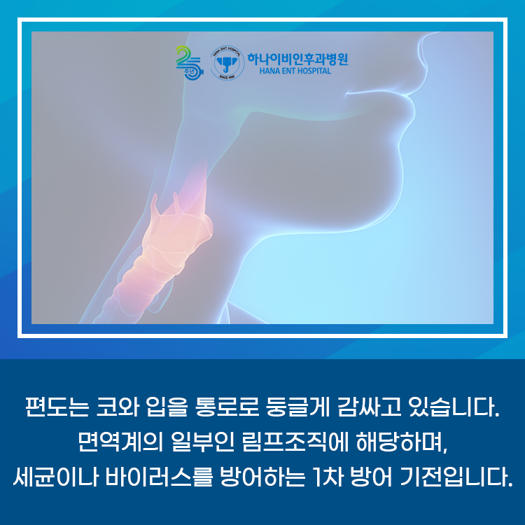 편도는 입을 크게 벌리고 목 양쪽을 보면 관찰이 가능합니다. 목젖 양쪽에 동그랗게 돌출되어 있는 것을 구개편도라고 합니다. 편도는 코와 입을 통로로 둥글게 감싸고 있어요. 면역계의 일부인 림프조직에 해당해 만 3~5세까지 입이나 코로 유입되는 세균이나 바이러스를 방어하는 1차 방어기전입니다. 성인이 되면서 면역의 기능은 다른 기관으로 옮겨가고 편도의 크기도 줄어듭니다.
