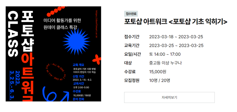 저도 그랬는데 이번에 동대문구 답십리 영화미디어아트센터에서 정규 클래스가 아니라 무려 하루! 원데이 클래스 형태로 포토샵 강의를 연다고 해서 한번 방문해봤어요.