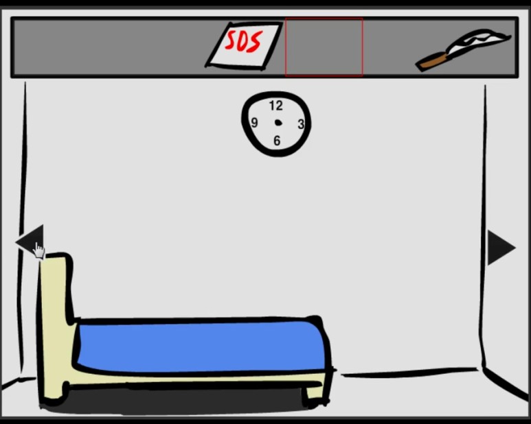 침대가 하나 설치되어 있는 방안에 들어가서 우선 시계와 바닥을 보세요 뭔가 작은 단서를 찾는 것이 매우 중요한 만큼 탈출에 필요한 도구를 획득해야 합니다. 현재까지 가방에 보관하고 있는 것은 손도끼와 SOS가 적용된 메모장밖에 없습니다.