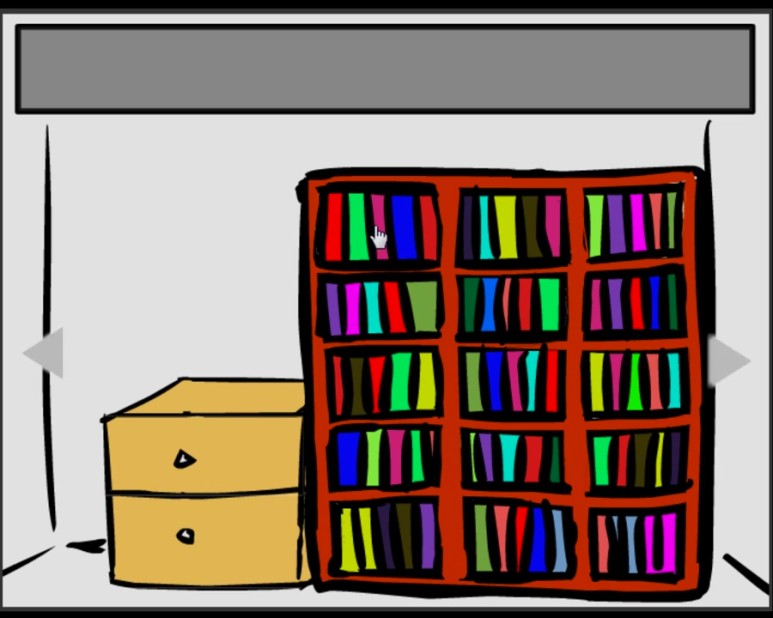 넓은 책장과 2칸의 서랍이 놓여있네요 먼저 책을 한 권씩 마우스를 클릭해서 특별한 것을 찾아내야 합니다. 그리고 왼쪽에 있는 서랍도 위층, 아래층 모두 열고 안에 어떤 것이 있는지 확인해 주시면 좋겠습니다.