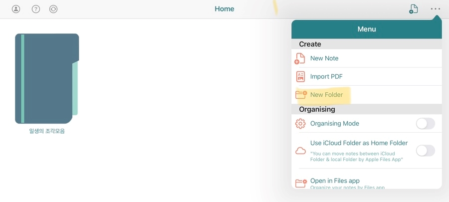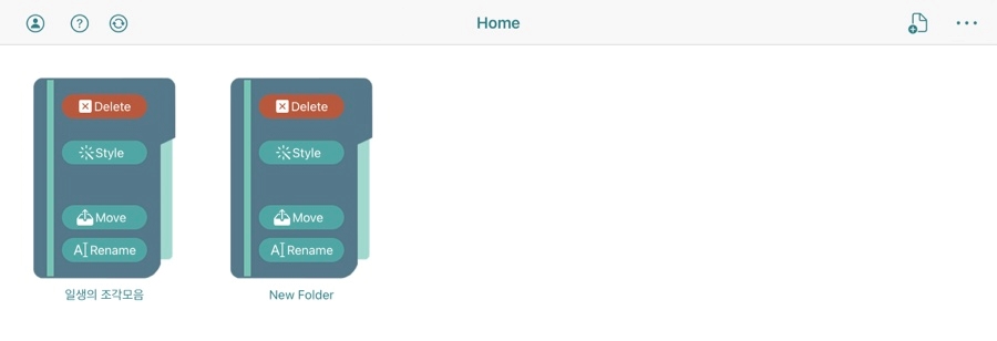 뉴폴더를 누르면 사진처럼 폴더가 생성된다. 이름은 폴더 작성 시 변경해도 되며 홈에 있는 노트나 폴더를 2초간 누르면 아래 사진처럼 이름 수정 또는 폴더 삭제가 가능하다.