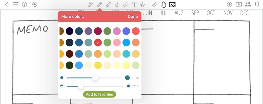 펜, 연필, 형광펜 등 농도와 펜의 크기를 자유롭게 정할 수 있다.노트마다 마음에 드는 펜 종류를 6개 정도 등록할 수 있다.이것도 편한 부분 🙂