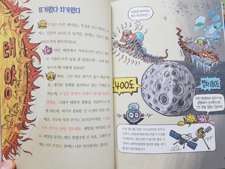 가스덩어리 태양, 삼겹살 가마구이 먹고 싶어요지금 배고파요태양도 자전을 한대요 몇 살이에요? 제가 잘못 들은 거 아니에요? 45억 살이요?각 장에 레인77의 우주 빅데이터가 나옵니다. 놓치지 마세요! * 우주 빅데이터 1 : 태양계의 비밀을 소개합니다. 따끈따끈하네요 2.2번째 여행지:수성과 금성 항성, 행성, 위성 구분 설명 깨끗합니다. 사전과 공전을 알아 두십시오 수성의 특징은 태양에 가장 가깝고, 가장 작은 움푹 팬 크레이터가 많습니다, 낮에는 400도, 밤에는 영하 180도.도대체 일교차는 얼마입니까?그래도 얼음과 유기물이 있대요그럼 생명체도 있을까요?